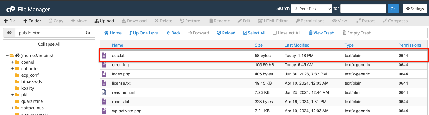 To add ads.txt file to WordPress without plugin, we need to go to cPanel to upload ads.txt file to the root directory of the website.