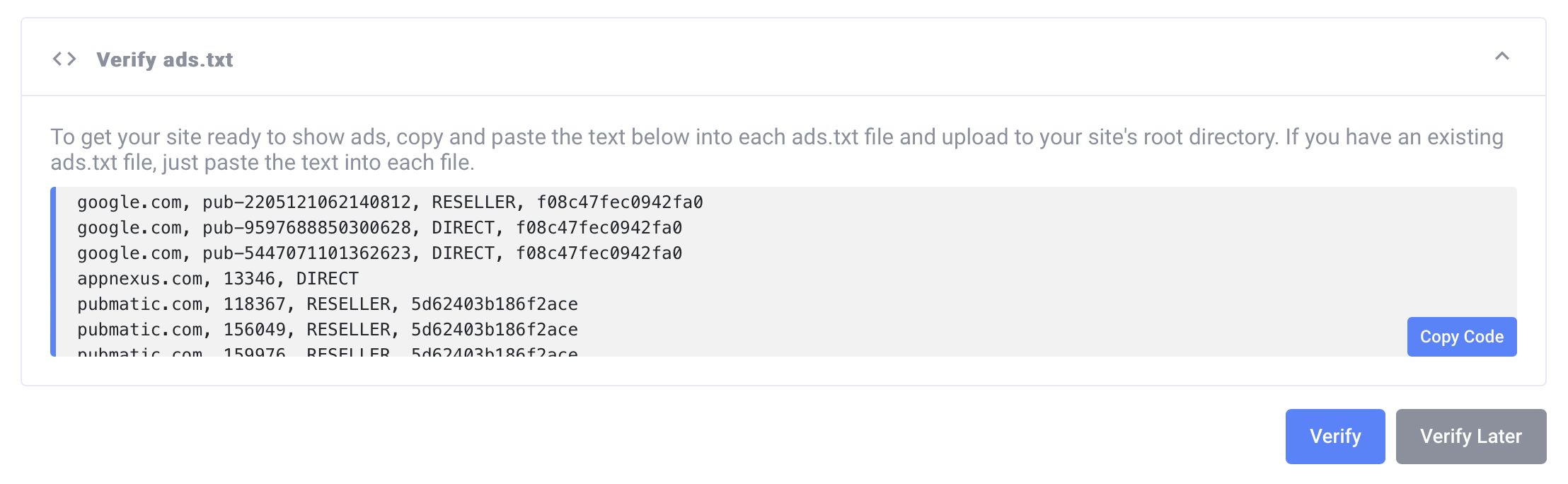 If your site has just been added to Adsconex, click "Verify Ownership" to find and copy the list of publisher IDs in the Verify ads.txt table.
